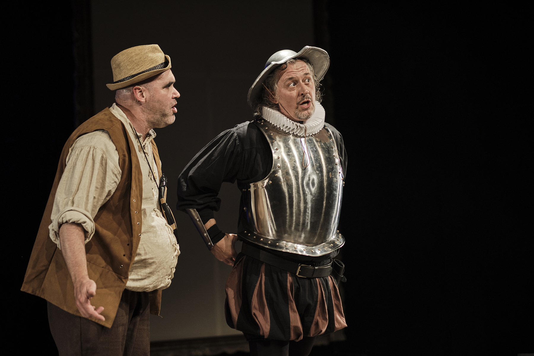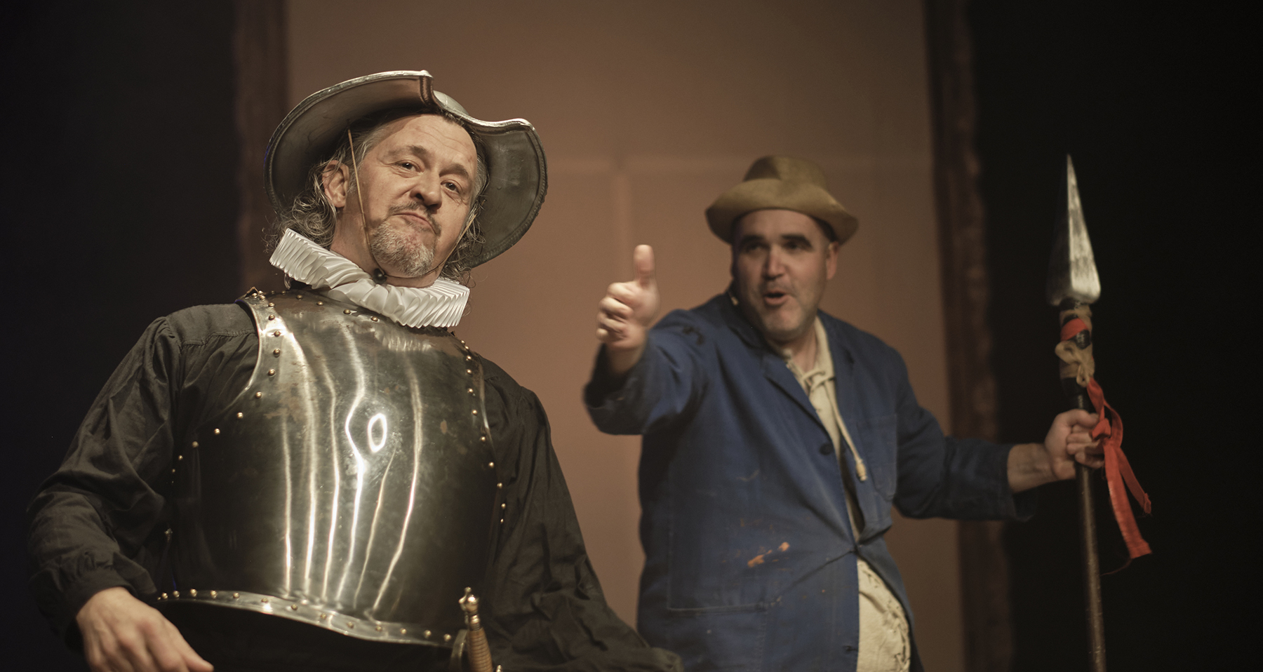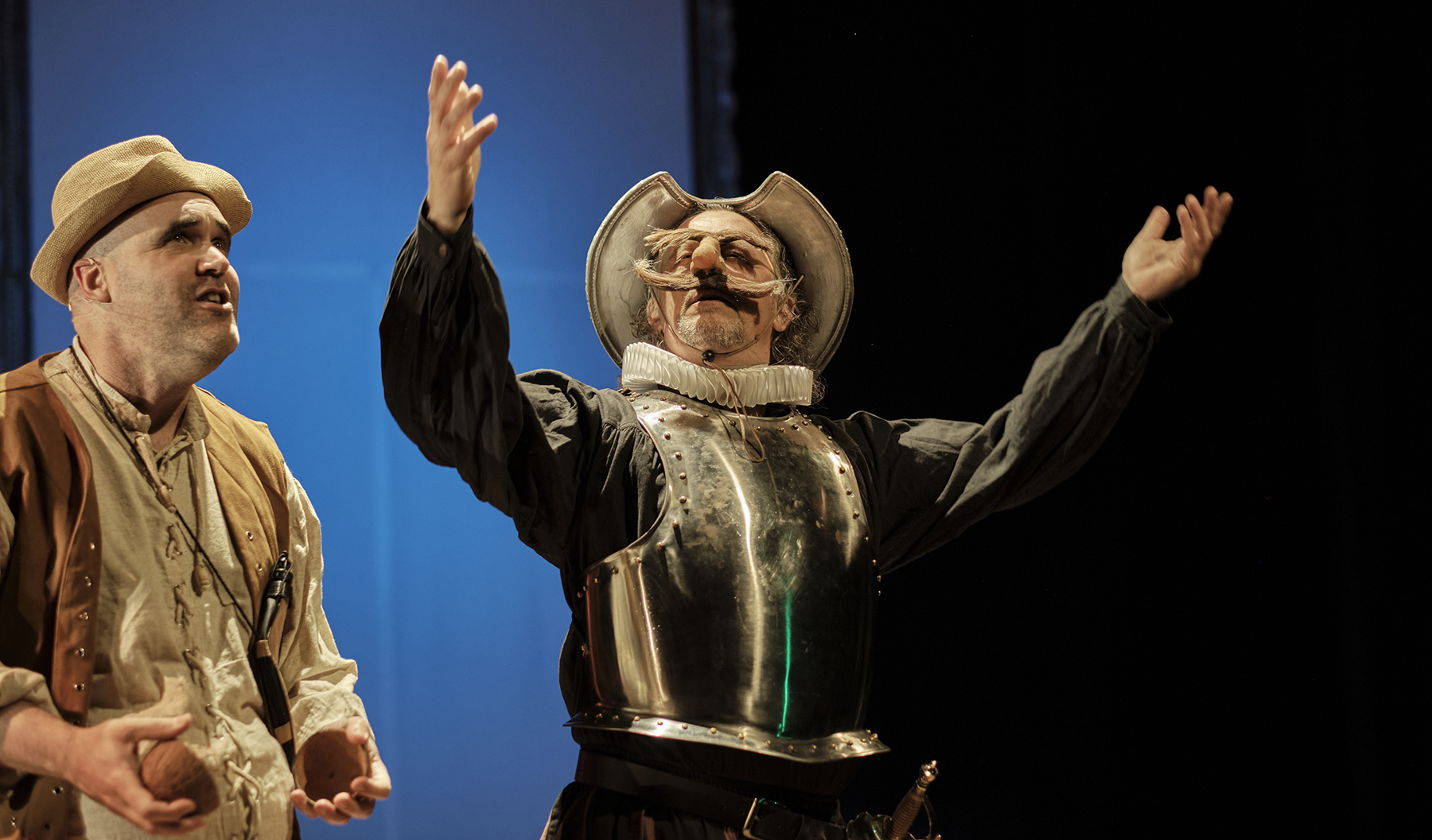 Després d’Un Tal Shakespeare, Marcel Tomàs s’endinsa en l’univers de Miguel de Cervantes per trenar una història divertida, esbojarrada i hilarant al voltant de la relació de dos amics que són la més pura essència de l’amistat. Dos personatges antagònics, amb una mirada molt diferent cap a la societat que els envolta. Un Quixot romàntic i somiador, al costat d'un Sancho Panza pragmàtic i realista. Són els clowns perfectes.